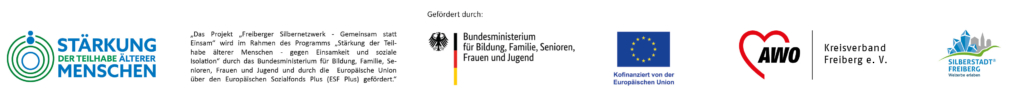 Wir, die AWO KV Freiberg e.V., nehmen als Teilvorhabenspartner der Stadt Freiberg an dem ESF-Plus-Programm: „Stärkung der Teilhabe Älterer -Wege aus der Einsamkeit und sozialen Isolation im Alter“ mit dem Projekt „Freiberger Silbernetzwerk – Gemeinsam statt Einsam“ teil.
