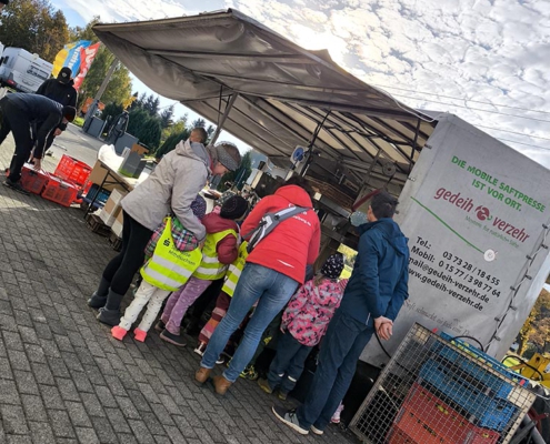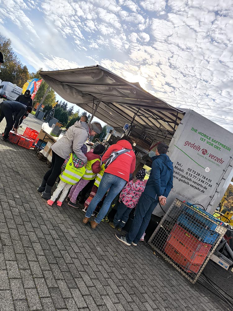 Mit mehreren Kilo Äpfeln im Bollerwagen zogen die Kinder los, um zuzusehen, wie aus ihren Äpfeln leckerer Apfelsaft hergestellt wird. Vom Sortieren bis zum Pressen – alles wurde neugierig beobachtet und begeistert kommentiert.